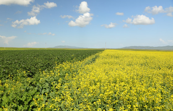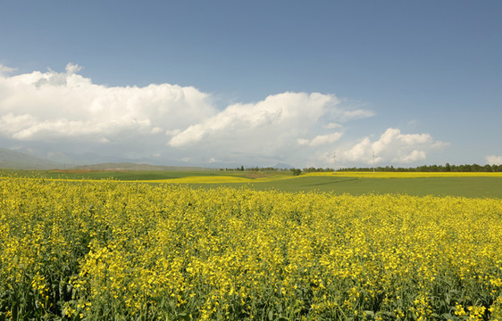 距特克斯60公里的昭苏,油菜花盛开时间晚、花期长是全国有名的。恰逢6月底7月初的油菜花盛开期,在这样的好天气里决不能错过。577国道正在改建中,路两边一片一片的鲜黄挑动着人们的神经,纯度极高的蓝天、白云、黄花在召唤着人们靠近它,有些地方专门辟出一块空地让人停车,这一路可随时停车拍照。