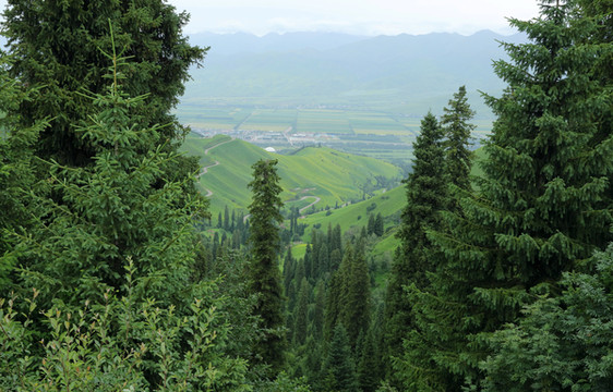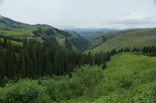 翻过几个达坂海拔下降,山形柔和起来,整个山被绿色覆盖,细高的杉树(是所谓的雪岭云杉吗?)有规律地排列着,像是被划了线。这是来到了那拉提。黑头羊似乎是这里独有。