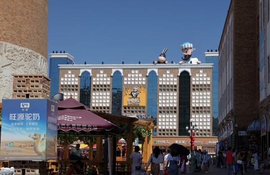 二道桥附近的国际大巴扎是乌鲁木齐的象征,游客的必到之处。这里面积巨大,汇集了各种干果店、手工店、玉石店、饮品店、面包店、特色护肤品店,等等。但巴扎只宜逛不宜买。我们中午之前就到了,开张的摊位不多,整个大厅大约一半是没租出去的状态,问了几家干果店,价格比去年南疆高不少。广场北边的楼里除了卖玉器首饰,还有几家大餐馆,民族风格装修金碧辉煌,连卫生间都很漂亮。阿凡提食品店也占据了不小的面积,买了他家的奶茶和切糕,三块切糕99元,一包奶茶36。走不远又遇到一家阿凡提,可以称分量买切糕。切糕是用葡萄糖浆把各种干果粘在一起,以核桃为主,吃起来甜中带点苦涩。文创冰棍也发展到大巴扎了,芭蕉扇形雪糕10元一支。