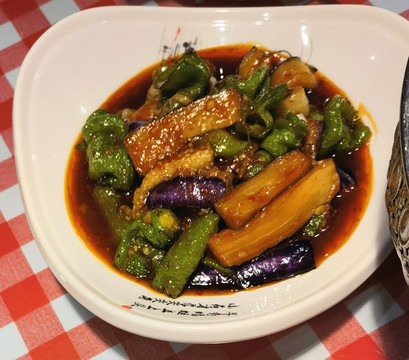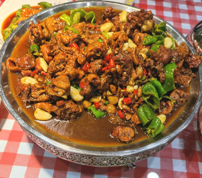 一进门是个明档,在炖鱼头。芦花鸡和鱼头泡饼是主打菜。我们点了微辣的芦花鸡,一大锅,鸡肉比较紧,味道不太打动人。青辣椒茄子甜甜的,是这一路吃的最好吃的辣椒茄子。酸奶5块钱,浓厚微酸,很赞。