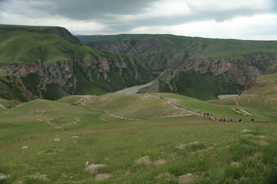 鳄鱼湾要走下很长的坡才能看到全貌,据说要花一小时,我们只在上面凑合拍了条没有头的“鳄鱼”。从山顶俯瞰九曲十八湾很壮丽,可惜刚下过雨,透明度差。但已经很感激了,毕竟雨停了。也庆幸自己没被雨吓到,坚持下了车。库尔台索道站有卖餐食的,也有桌子凳子供游客使用,我们在这儿吃了自带的午餐。好像在景区里只看到这一处吃饭的地方。乘快艇从水上看不到太多景色,多半是起个摆渡的作用。速度挺快,要穿救生衣。