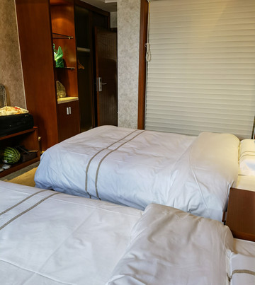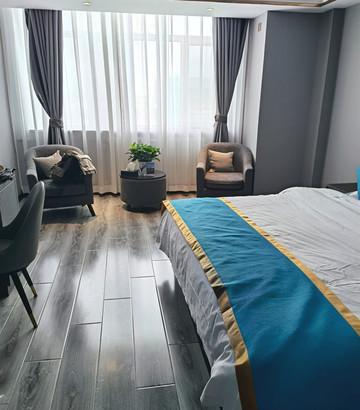 特克斯天悦生态酒店是此行硬件最好服务最差的酒店,700元是我拿到的优惠价。房间超级大,装修豪华,设施齐全。可惜卫生间和房间之间的大玻璃没有遮挡帘,有点别扭。淋浴喷头堵了一半的出水孔,只好用手持喷头。体重秤是摆设,不能用,给客房中心打电话说来给换电池,直到我们离店也没换。晚上连电话也不通了,第二天前台女孩说是施工挖断了电缆。两点到店房间还没收拾好,让三点再来。三点回来一间刚收拾好,另一间还在进行中。收拾好的一间洗手盆下水堵了,流了一地水,只好找人来清理。晚上前台值班人员在沙发上睡觉,早上八点才起来工作,客房上班时间更晚。打电话给总台、客房、前台都是前台一人接听,再找不到第二个人。早餐品种多,质量极一般。