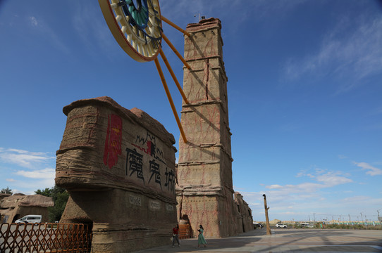世界魔鬼城又名乌尔禾风城。位于准噶尔盆地西北缘,距克拉玛依市约100千米,呈北西--南东走向,是个大风口。景区面积约15平方千米,地面海拔350米左右。是世界著名的两大雅丹地貌之一。游客只能坐景区车游玩,车上有解说,很多景观都是这样在车上听着解说一掠而过。车大概停三站,下车也只能在车站附近走走,大概一个多小时就转完了。最后一站有个超大的小商品市场,仿照山洞的样子建造,极有特色,只是出售的商品没特色。