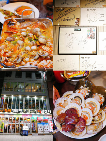 釜山必打卡的一家海鲜锅,明星签名超多哦!EXO常光顾,还有灿勋、世勋等人的签名。活章鱼是主打,不知道你敢不敢吃,味道还是很可的。海鲜锅���分量又足又鲜,跟买衣服一样有大小号,M和L的区别就是多了一个大龙虾,个人觉得M三个人够了!泡面和芝士一加,谁都不爱就爱它哈哈.牛肉汤饭也好吃,配上小烧酒,就是绝!菜单上有中文,省的找翻译软件!我们点了精品海鲜汤的M尺寸份量刚刚好!离海云台海边很近,吃完饭可以去海边转转!