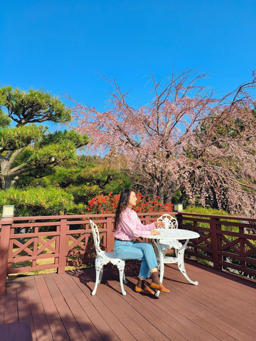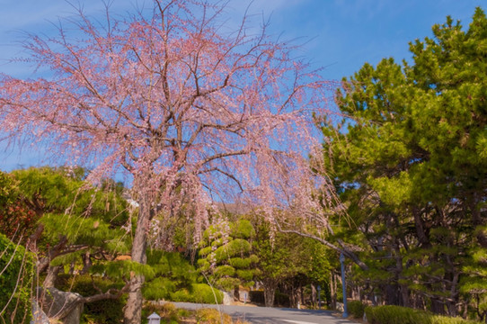 庭院里的两株樱花树也绽放了,粉粉的,映衬着绿植和回廊,美得像幅画