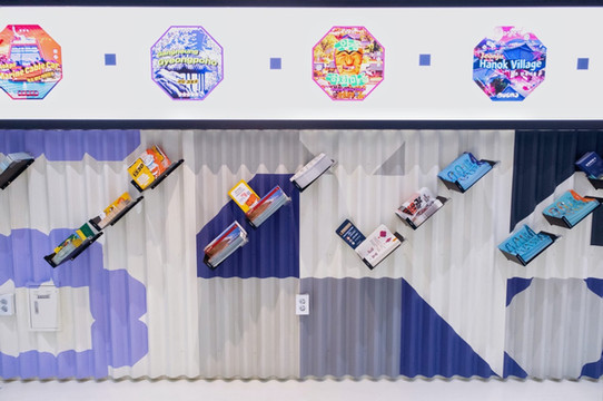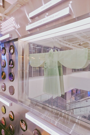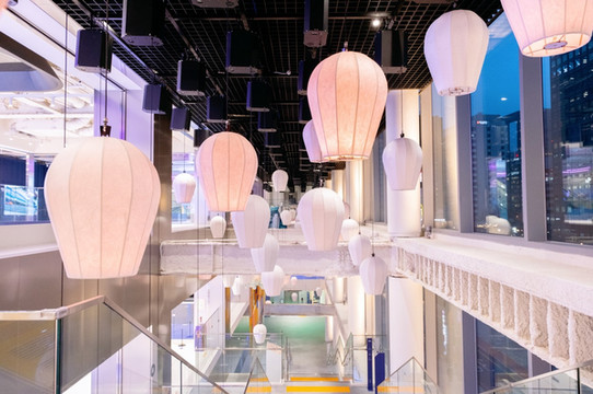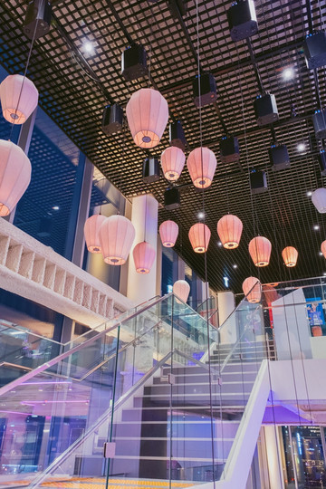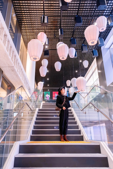 楼梯的位置和玻璃幕墙区域也做了精心设计,有彩色的韩屋模型、韩服展、纸质灯笼伴随着灯光闪烁和升降起落,超级有氛围感,真就是古典与潮流的碰撞!