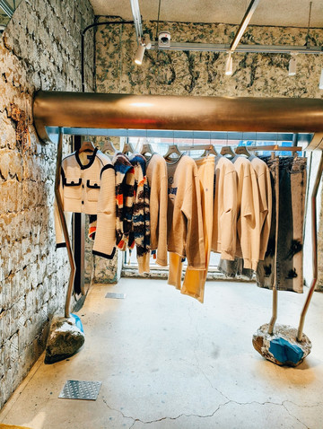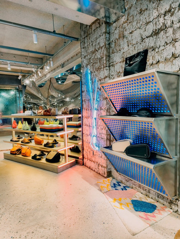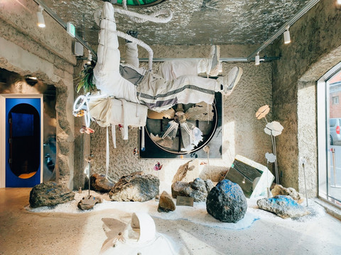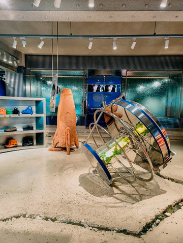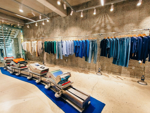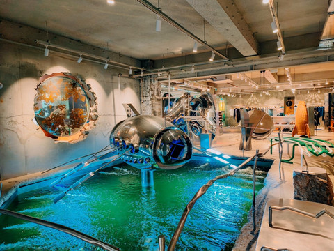 是展览+卖场一体的模式,是太空舱主题,科技感十足。服饰款式也蛮多的,标志性的克莱因蓝,好显白,更衣室也是太空舱的设计,还有床和枕头呢