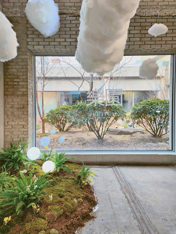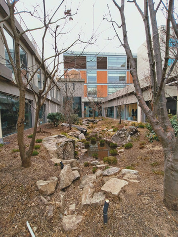 整体建筑是U形,U形中庭种满了植物,还有一汪水池,透过玻璃窗看出去很漂亮,等到夏天绿植郁郁葱葱的时候,肯定超级美!没想到老旧工厂改造后也能这么抓人眼球