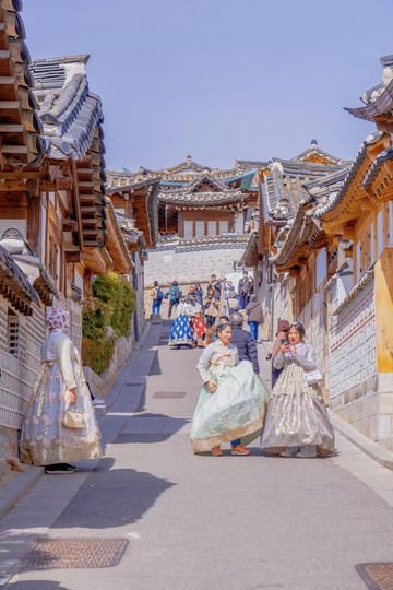 不愧是 韩国 旅行目的地的顶流,主街 道真 就是人山人海,穿韩服游览的游客超级多。身穿韩服、漫步古街,意境绝了!