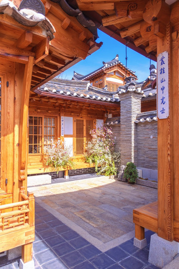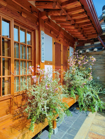 走到入口处,看到古典的韩屋和绿植、白花交相辉映,心情已经开始愉悦起来了!