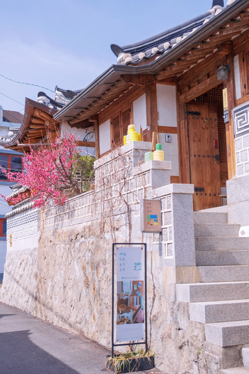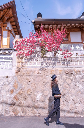 绕到巷子深处,误入一家私人韩屋,风景超美,庭院里的花早已绽放,庭院墙头露出的一株红花别提多浪漫了!