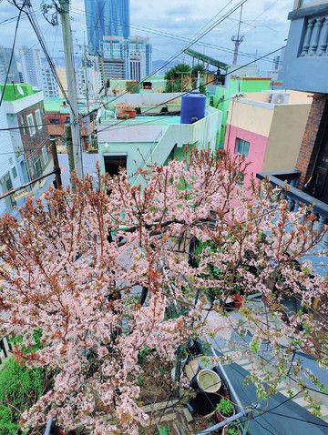 阶梯走到一半时,还有一些小型雕塑和可爱的装饰。回望身后,一株早樱也已绽放,映衬着彩色民居,超级美