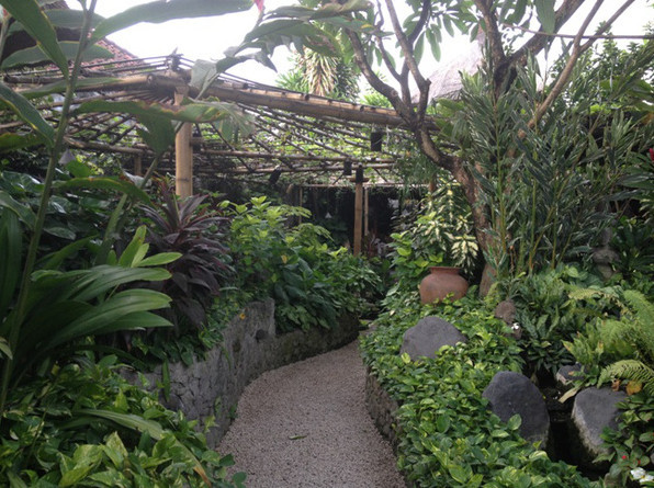 也是小花园风格的,很雅致。 竹藤椅子,藤蔓顶,上面种着巴厘岛的标志花。不管3721,我先点两杯鲜榨芒果汁,这是网上推荐的,然后点了两个餐。芒果汁先上来,吸了一口,哇塞!味道好极啦!是纯芒果榨成的,口感又甜又滑,于是我对这家餐馆的美食也期待起来了。