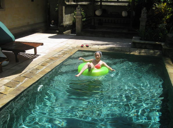 本想把老公叫起来一起吃,可是看他睡的那么熟,肯定起不来,算了,一个人先吃了,可是真是一点不寂寞呢!小松鼠看到有好吃的,也跑来凑热闹了。于是我放了一小块面包在栏杆上,他跑过来一口叼走了。这里的鸟也特别多,记得第一天晚上我们在泳池边吃的香蕉,还剩了3个就放在泳池边的小桌子上,一转眼的功夫,居然被鸟吃掉一半。怪不得,送来的早餐都有盖子和保鲜膜盖住,不然可能还没等到我们吃,就已经被动物们先享用了。哈哈!吃完早餐,老公还没起床,我想想不能浪费这明媚的阳光和清澈的泳池呀,于是,我冲进房间,掏出包里的救生圈,打开,使劲吹起气来。原本想直接跳下水玩一玩的,可是有点害怕,毕竟自己不会游泳,老公又在睡觉,虽然泳池的水只有1.2m,但是万一就这1.2m高度的水把我给淹死了,我可就死的太冤枉了。灵机一动,带上游泳圈总没事了吧。我一个劲的往救生圈里吹气,呼呼的!就在我吹的脸胀的通红的时候,就听到老公噗哧一声笑了起来!他醒了!我心想,糗大了!惹来了我对他狠狠的一记白眼,终于,我也忍不住笑了!老公被我这样一闹,睡不着了,起来吃早餐,顺便拿着相机给我拍两张。我不会游泳,做在救生圈里也很逍遥自在!
