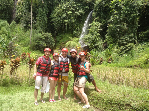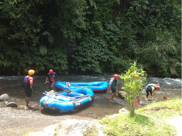 这是阳光明媚的早晨,一大清早我们就起床,因为今天要去Telaga waja漂流了,我和老公超级兴奋的哦,我们在来之前就已经让婚礼公司的客服帮忙定了漂流公司,USD40/人,除了3个小时的漂流外,还包括酒店接送和一顿午餐。早上8点半,漂流的司机就在酒店大堂等我们了。我们匆忙的在餐厅烤了2片面包拿了几块西瓜,嘴里一塞,就上车,启程罗!!!我的天呀,这一开就是1个半小时啊,先是小路,后是盘山,我这胃里翻腾的难受,差不多要到的时候,实在忍不住让司机在路边停车,下去一阵狂吐,哎哟。。。终于算是舒服了。没过5分钟,终于到了。哇塞,在这群山环绕间的小溪流,水流湍急,这种感觉真难以形容.