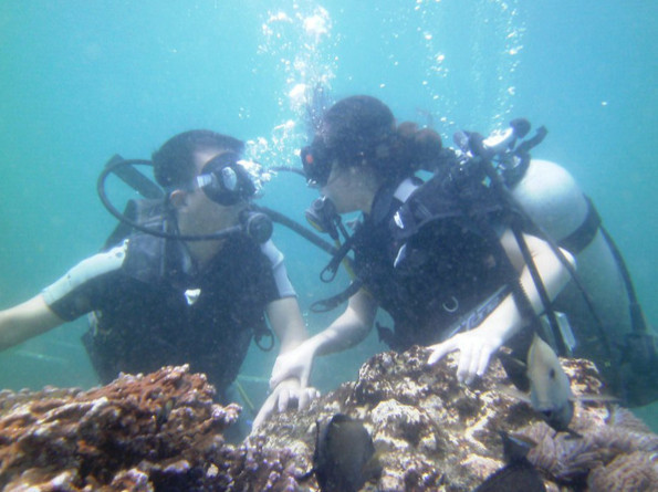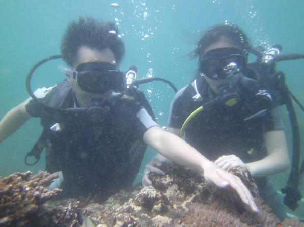 大概15分钟后,我们就上来了。我在水下不知道碰了什么,可能是珊瑚岩吧,我的左手手臂一块皮肤针扎般的刺痛,接着长出了一片小红疹。教练说用酒精擦一下就没事了。老公说我的皮肤太嫩了,一定是过敏了。我哭啊!后来才知道,原来海底的珊瑚可能有毒的。所以在这里要告诫大家,如果潜水,千万不要轻易的去触碰海底生物,有许多珊瑚,海水鱼都是有毒的,被扎一下可能就没命了。不过也可能有些水土不服的关系,我的肠胃总是不太舒服,在水下呆了一会,一上来就觉得晕眩,在船上就吐了。已经是第二次了!我怎么那么悲催啊!