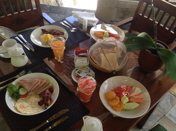 天慢慢亮了,老公还是不舍离去,用相机不停的记录这美丽的云彩。我坚持要等太阳露面,可是老公说,就算露面也不能算日出了,我拗不过他,只能作罢。我知道,其实他想快点回别墅继续睡!懒虫!回别墅继续睡,早餐在9点钟准时送到,门铃把我叫醒,看看老公,还在打呼噜,那么响的门铃声也没把他吵醒,无语,算了只能自己起来去开门了。服务员把早餐放在游泳池旁边的小亭子里的桌子上。哇塞,还真的挺丰富的,是不是点多了呀!