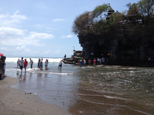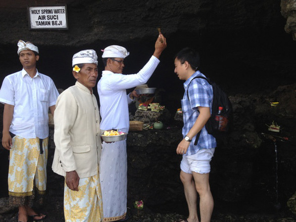 突然,我们发现遇到几个中国人,听到有人说中文,感觉很亲切,我就忍不住上去搭讪了几句。发现他们额头上都贴着几粒糯米,我好奇的问他们。哦~原来在海神庙的侧面有个小洞口,好多人聚在那里,有当地人在那儿为游客做祈福。这是巴厘岛的风土人情,挺有意思的!我们也跑去了。