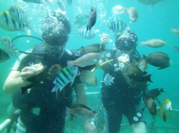 我们最期待的是深浅,其实我的心里有些怕怕的,我不会游泳,现在要让我钻到水下去那么久,我心里总有些没底。有一个教练带我们潜下去的,他也会在水下帮我们拍照片和录像。下水前,教练先教我们一些潜水常识,比如怎么咬氧气嘴,耳朵进水怎么办,眼镜进水怎么办,氧气管进水怎么办之类的。出发后,先坐船到海中央。我们下海了,其实刚下去的时候,我真的挺怕的,海水有些冷,我一下去就使劲的吸氧气,我不停的告诉自己不要怕,豁出去了,心里也就真没那么害怕了。一开始耳朵挺疼的,到了水下,咽了口口水就好了。教练看我们还挺适应,就放开手,到我们对面帮我们拍照去了,他拿出一包面包,在面前一甩,哇塞!忽然之间,成群结队的小鱼游了过来抢食吃。真的太好玩了。我们也拿出事先给我们的面包喂起鱼来!各式各样的鱼越来越多的聚集过来,我伸手想捞它几条玩玩,可是小鱼速度太敏捷了,刚一伸手,它就跑了!我总是有些害怕,水的浮力实在厉害,我总是觉得一动就要飘走了,所以我总是紧紧的抓住珊瑚岩。