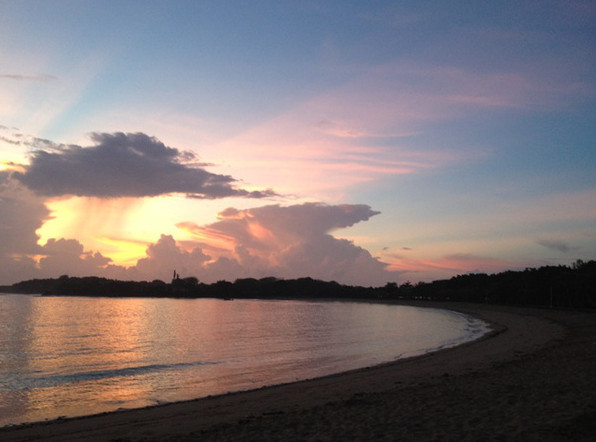 一大早,5点半,我们调了闹钟,扒开眼皮,蓬头垢面的就冲出别墅,往海边走去。满心期待,没想到咸蛋黄被厚厚的云层遮住了,但是云层被太阳照出一片金红,远处的一片红云像一朵巨大的浪花!大自然的神奇,美的无法形容,这是相机无法记录下来的美丽。