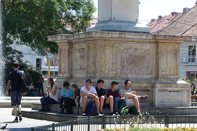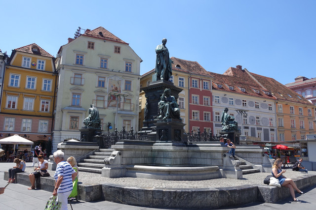 市政厅前的中心广场正中是为纪念格拉茨最受爱戴的君王——约翰大公爵而建的雕像和喷泉。公爵的雕像旁围绕着四尊美女铜像,分别象征着茵斯河、穆尔河、德拉瓦河和桑恩河四条河流。