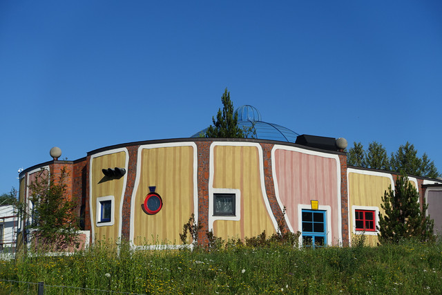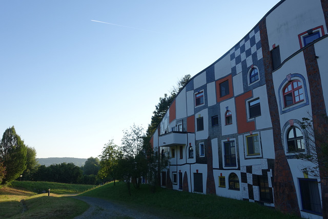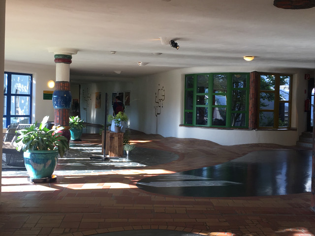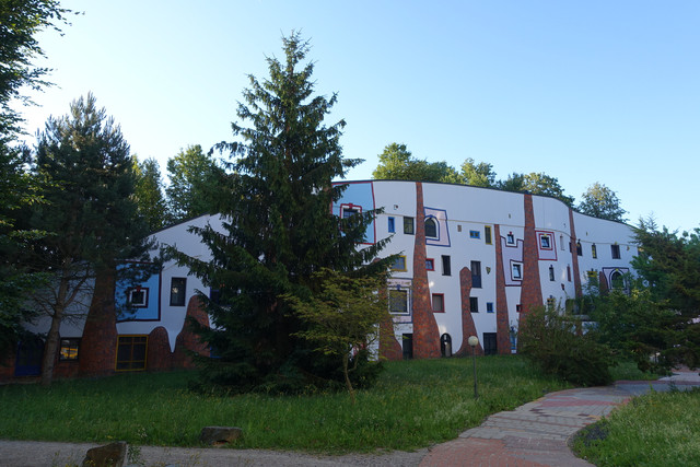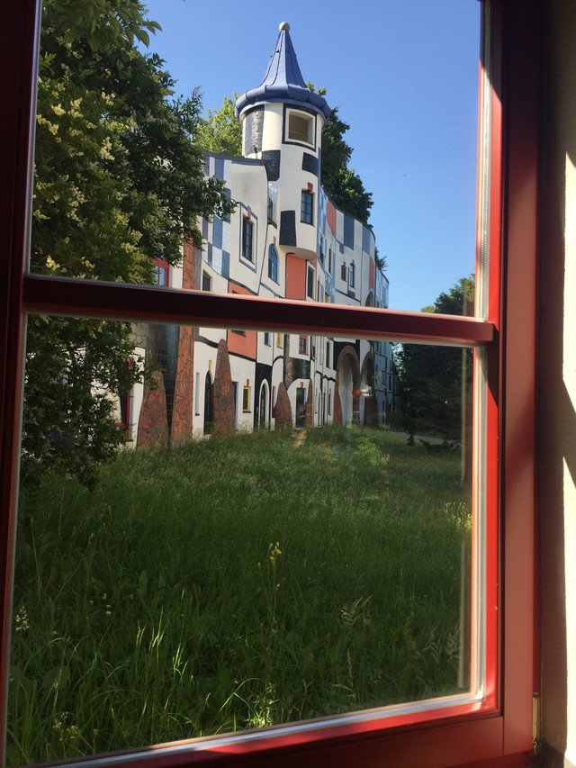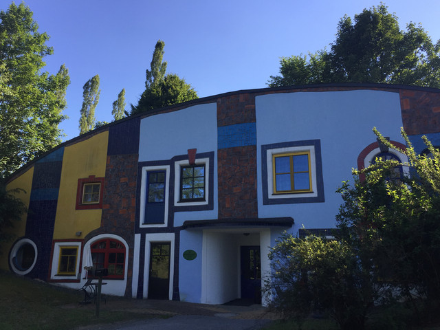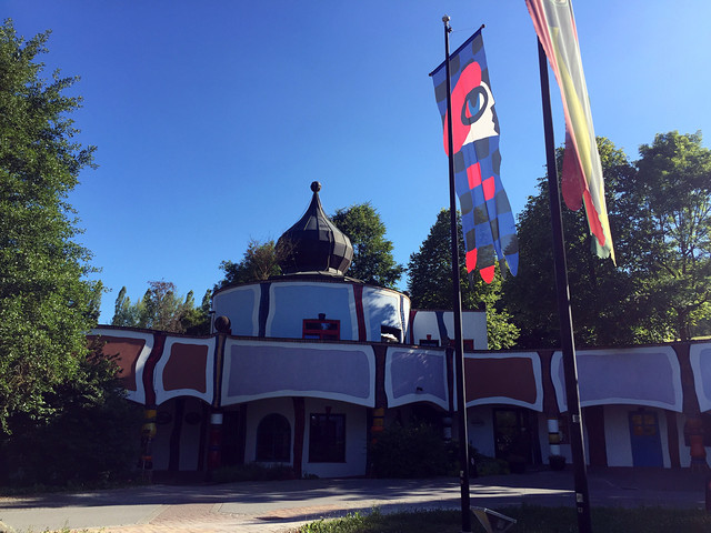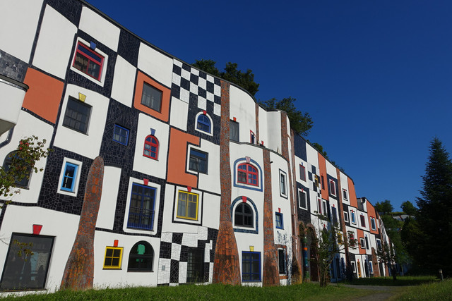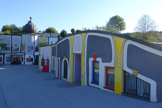 离开格拉茨并不远,我们进入到一处风景优美的所在——百水温泉山庄。这不仅是座温泉酒店,更是奥地利最古怪的国宝级艺术家、画家、建筑设计大师百水先生的作品。这位老先生反对一切直线、刻板的、对称的和条条框框,大胆运用明艳亮丽的色彩,讲求人与自然的和谐。他的作品充满了活力与童趣,真正让人感觉走进了童话世界。