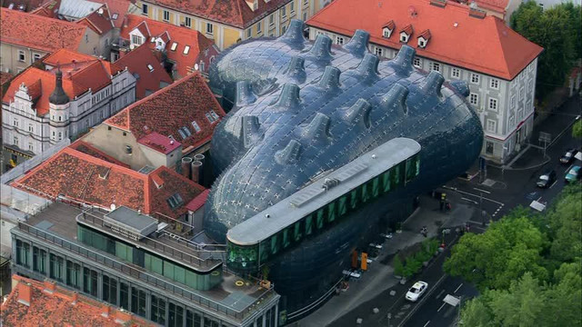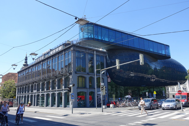还有另一处,就是让渴望变化的格拉茨人自己都接受不了的现代美术馆。从这角度看过去,这建筑除了采用了玻璃和塑料材质以外,也并没有传说中出格到无法容忍的外形之类的感觉,会不会格拉茨人太夸张了些?!