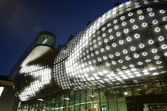 现代美术馆于2003年建成,英国设计师彼得库克完美诠释了"生物存在式"建筑理念,把玻璃塑料材质的超现实主义建筑嵌入十七世纪的老房子里(红砖顶部分),形成了极为突兀超强的视觉反差。据说那一大坨的部分被称为称为"胃",竖起来的是“管口”……所以说进去参观的人们是被吸进“胃里”让艺术“吞没”咯……