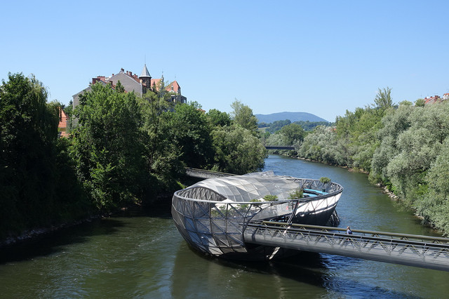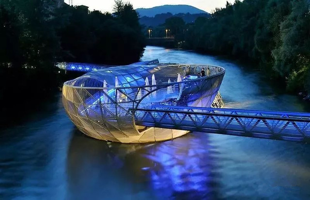 也许是人们看腻了满城的文艺复兴风格,想找些新鲜玩意儿,格拉茨还有一些极为前卫和特别的存在,比如这座人工浮岛——穆尔岛。它是由美国纽约设计师维多艾肯西设计,2003年建成的。更神奇的是这座钢与玻璃构成的穆尔岛还可以随着水位高低而升降,远远看去就像是一颗巨大的螺旋状银色贝壳,漂浮在河面上。