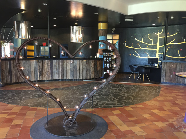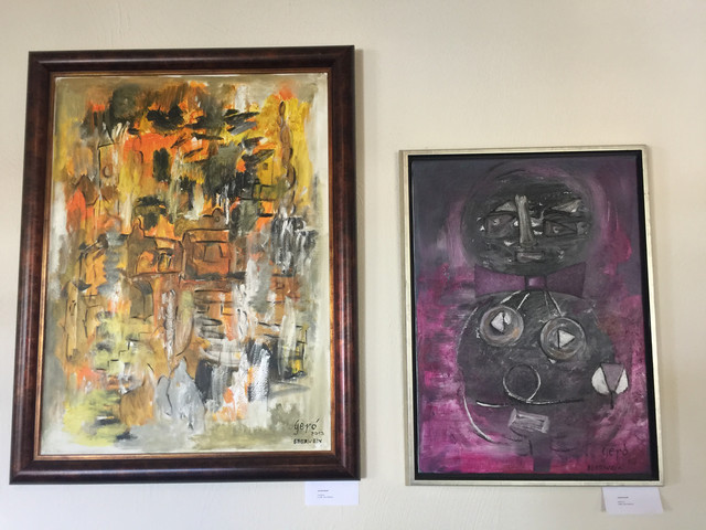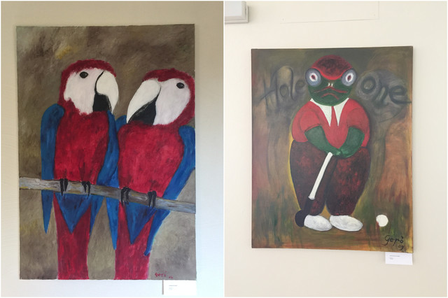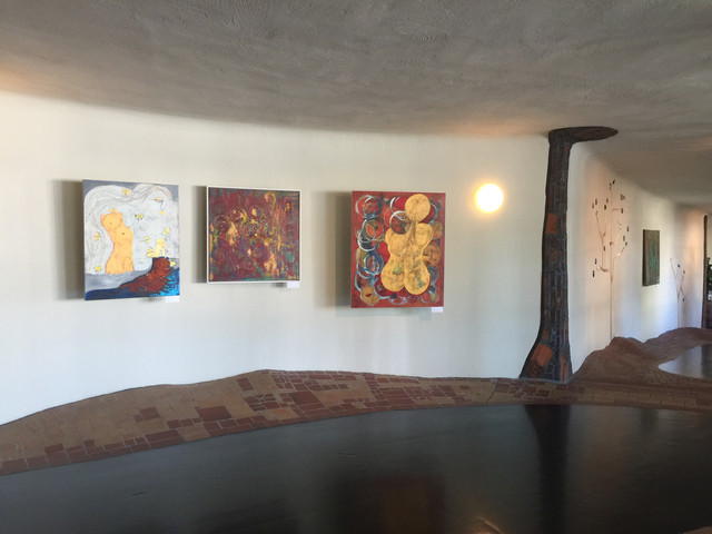 走廊的墙壁上悬挂着百水先生的作品,色彩艳丽,十分有趣。