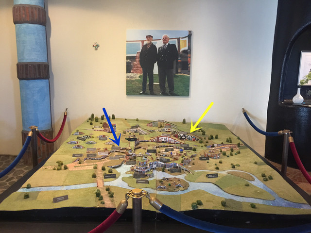 酒店的大堂在蓝色箭头的位置,而我们的房间则在黄色箭头那里,之间有各种奇形怪状的走廊相连接。那些走廊不但墙面扭来扭去,连地面也高低起伏,迷宫一般。我们两个人(路痴二人组)经过不断试错才从房间摸回酒店大堂,原本七八分钟的路走了近半小时。