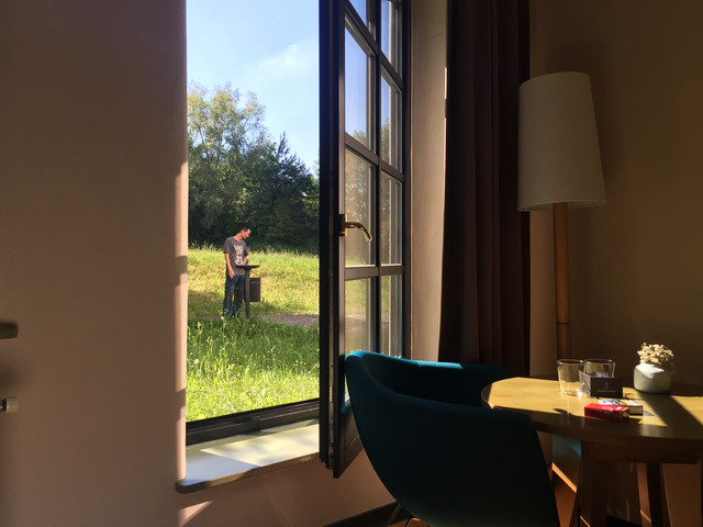 我们这间房子有个落地小窗,可以打开直接走到后面的草坪和树林里去。K同学非常开心,他很方便出去抽烟了(当时还没戒烟),让其他没有此便利条件的团友羡慕不已。