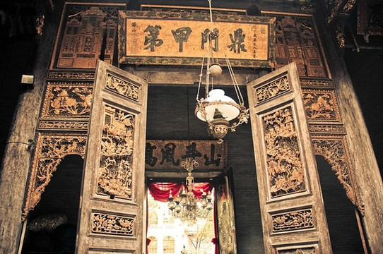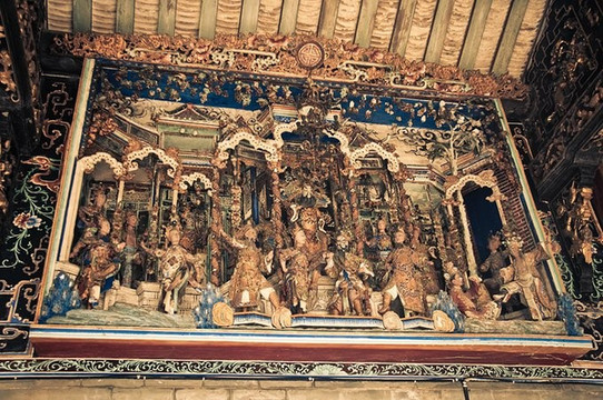 郑景贵对京剧颇为喜爱,祠堂墙上雕刻着京剧表演的场面,人物栩栩如生,做工精细至极。让人颇为惊讶的是,天井屋檐之上,居然又雕刻出一座新的小宅子,有门有窗,瓦片屋檐颜色染得非常舒服,最神奇的是门楣上还有“郑府”二字,城中有豪宅,宅中又有宅。