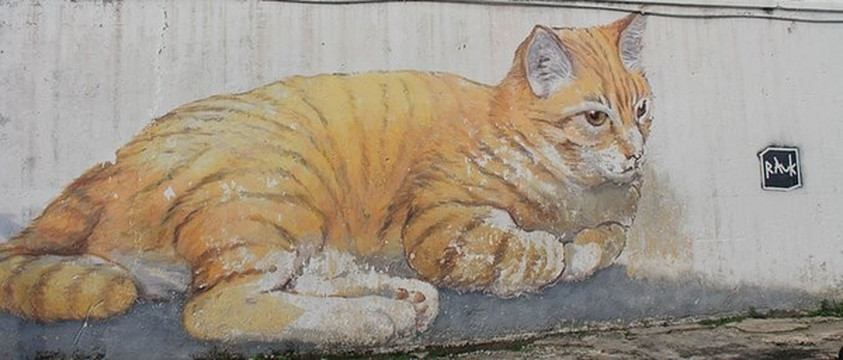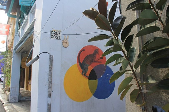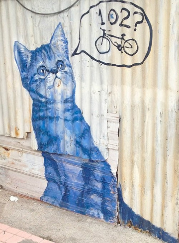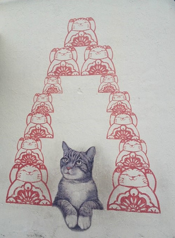 槟城的壁画可能和铁皮画一样,也是根据附近特色创作,比如有这么一条街,在并不太长的距离内发现了四幅以猫为主题的壁画,形态各异姑且称之为“猫街”吧。