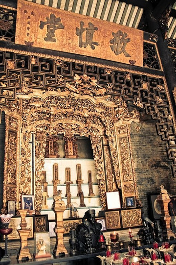 郑家的家庙,祠堂里供奉着家族的灵牌,桌上黑色的塑像就是郑景贵本人了。