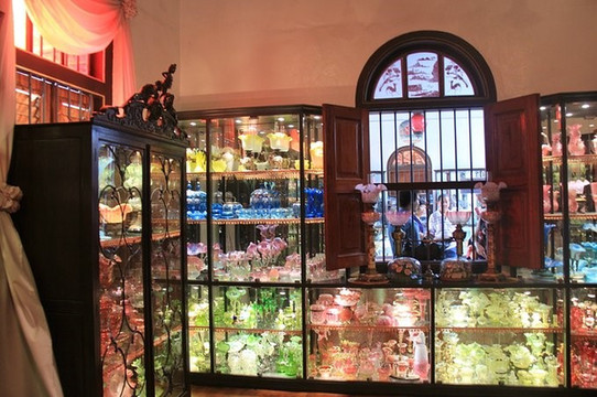 回到展馆,壁橱内的玻璃器皿异常精致,不同颜色的器皿分别在小娘惹出嫁前后作不同用途,娘惹文化中要讲究的有很多不能乱了规矩。