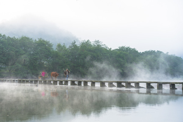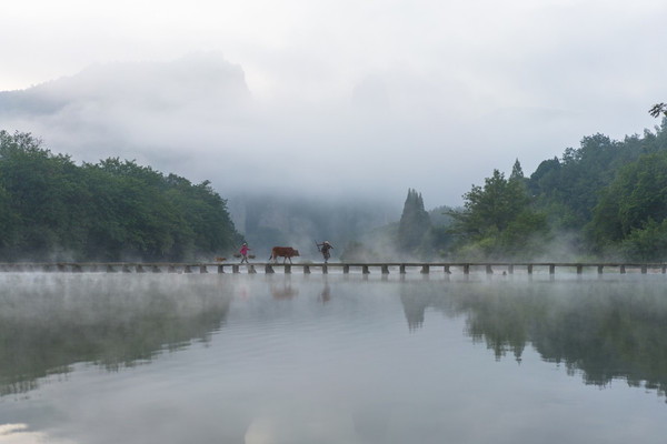 清晨四五点开始,朱潭山就会迎来一个属于老法师们的游园早高峰。当石板桥上水汽翻腾,背景是不远处的鼎湖峰,在仙气十足的氛围里,如有一两个农夫或挑着担子,或牵着老牛,跟着一条狗……如同从 中国 画里活了过来的画面感。来自各地的摄影师,带着长枪短炮,在最佳机位架好器材,在咔擦咔擦的快门声中,记录下的不止是这山水的柔情,仿佛还穿越了宣纸和时光,和数百年前的山水大家来一场关于艺术的对话。