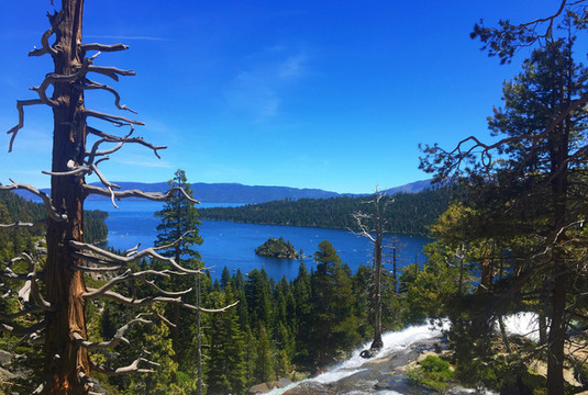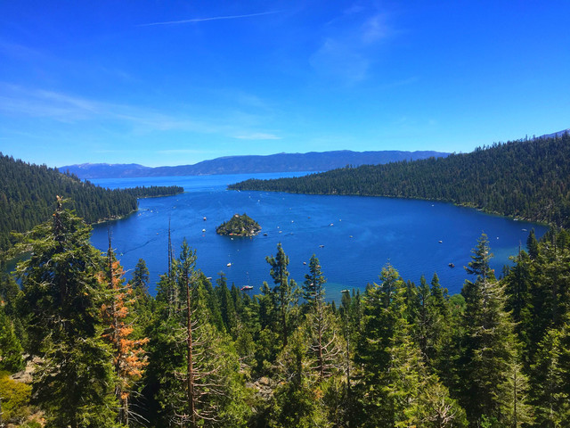 继续往前,我们便来到了太浩湖最著名的景点——翡翠湾 (Emerald Bay)。翡翠湾是因为湖藻过多湖水呈深绿色而得名。翡翠湾原来和太浩湖并不相连,数万年来两湖间的水流穿梭,凿穿岸边使其成为太浩湖的一部份。这里风景十分秀美,是众多游客留影打卡之地。