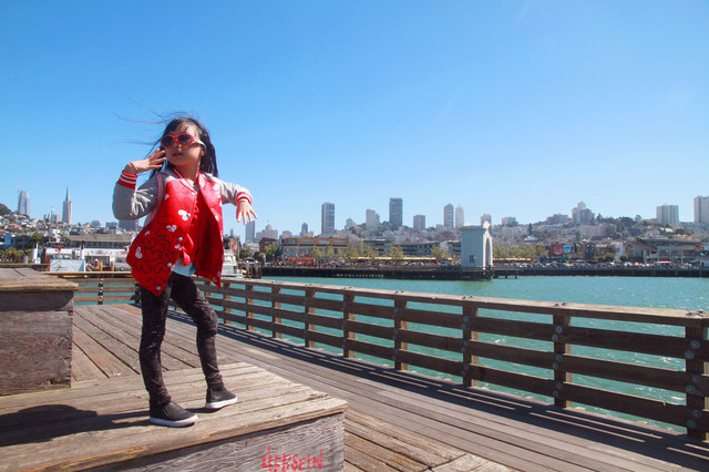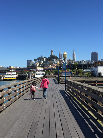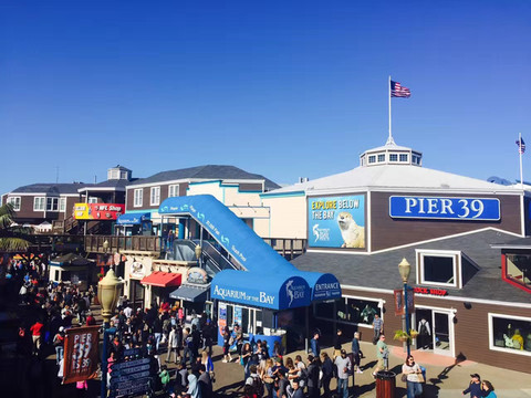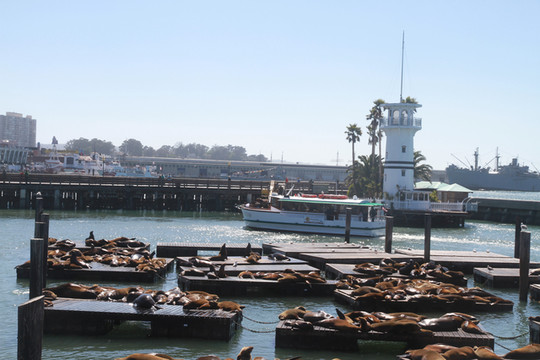玩了一会,继续往前走,很快就到了渔人码头(Fisherman‘s Wharf)。海风凛凛、游客攘攘,渔人码头是旧金山最受欢迎的观光景点之一,当然,荳妞最感兴趣的是街头艺人表演和看木筏上面的海狮。这些见惯大场面的家伙也相当给游客面子,他们一会儿互相嬉戏,一会儿又针锋相对;一会儿从水里蹦出水面,一会儿又优雅地滑入水中,仿佛这里是他们统治的王国。