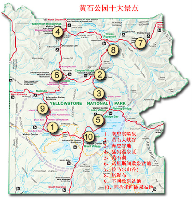 黄石公园分五个区:西北的猛犸象温泉区以石灰石台阶为主,故也称热台阶区;东北为罗斯福区,仍保留着老西部景观;中间为峡谷区,可观赏黄石大峡谷和瀑布;东南为黄石湖区,主要是湖光山色;西及西南为间歇喷泉区,遍布间歇泉、温泉、蒸气池、热水潭、泥地和喷气孔。园内交通方便,环山公路长达500多公里,将各景区的主要景点联在一起。
