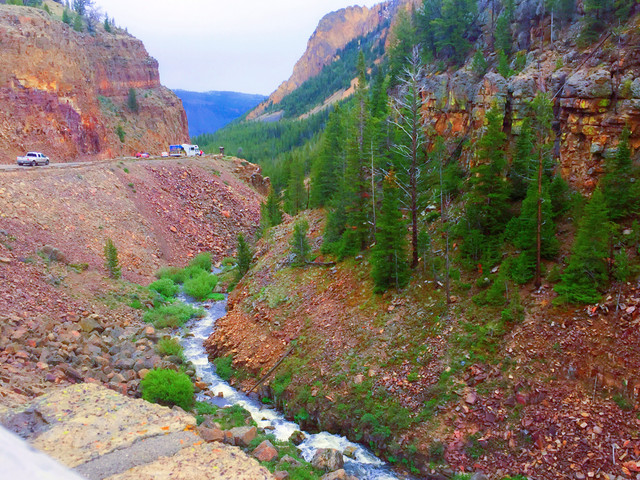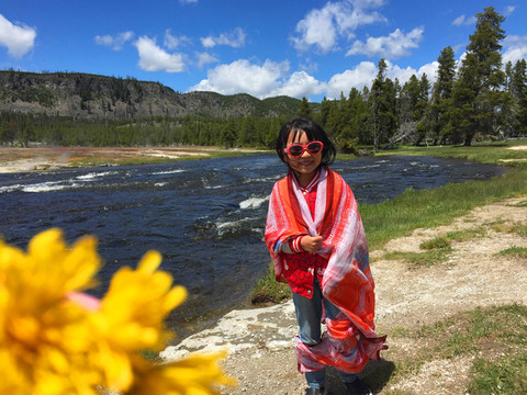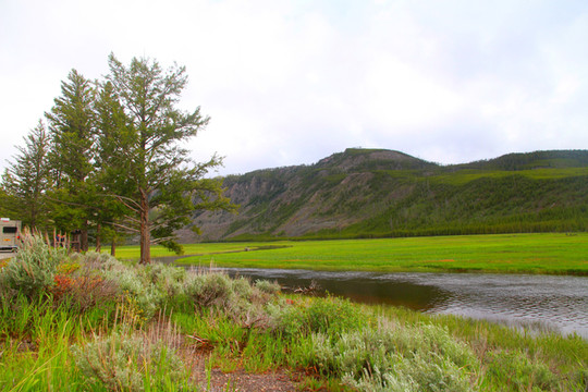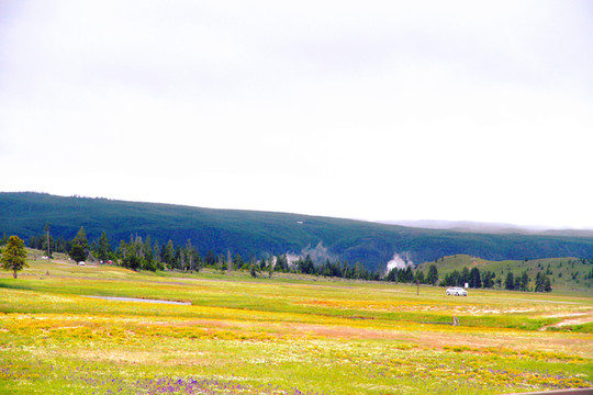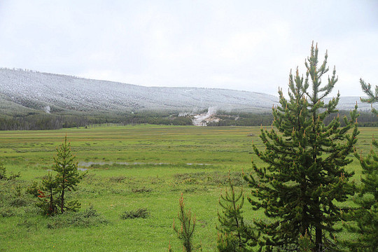 黄石公园景点以“8”字分布,需要完整的两天时间才能游览完。考虑黄石公园天气多变,当天下午到达西黄石后,趁着天气晴好,我们抓紧时间游览8字下半部部分景点。进入公园不久,展现在眼前的是绿草青青、溪流涓涓的田园牧歌景象;再走一会又是一幅树木葱葱、繁花似锦的油彩画。一路游览,窗外风景可以说是一步一景,引人入胜。