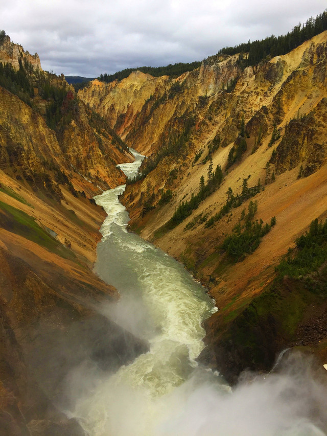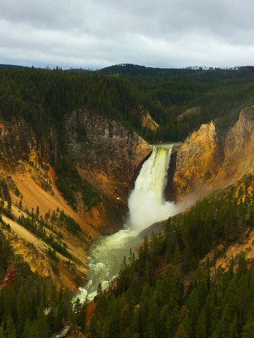 行驶了两个个多小时,我们来到黄石大峡谷,这是黄石公园最著名的景观之一,可以同时观赏壮观深邃的峡谷和飞流直下的瀑布,天气好,会看到一道彩虹横跨峡谷。黄石大峡谷有两个瀑布,Upper Fall上瀑布和Lower Fall下瀑布,下瀑布的落差更大,也更壮观,长期的河水冲刷形成了色彩瑰丽的岩壁,呈现出黄、橙、棕、褐等,印第安人称之为“黄石”。