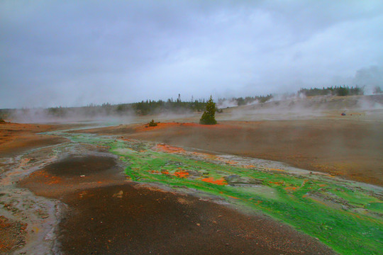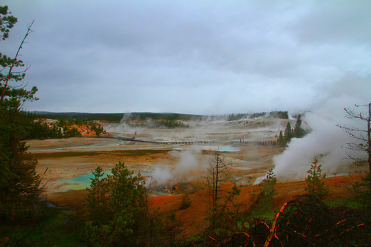 经过一个小时车程,我们来到了彩锅喷泉,也就是下间歇泉盆地,这是美国黄石国家公园占地最广的喷泉区。彩锅喷泉又叫做豆浆池,“豆浆”就是从地下不停喷涌泥浆,豆浆池就是一个泥浆喷泉池。该景点游览区域由一条800米的环形栈道组成,都是很平坦的道路,半个小时就能走下来。