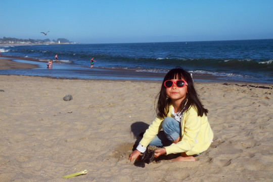看了一会儿水上精彩表演,我们驱车来到了圣塔克鲁兹。圣克鲁兹海滩是西海岸最美丽的海滩之一,它是冲浪和沙滩排球爱好者的圣地。黄昏时候,海滩上美丽的落日映红了天空与海洋,我们冲向了沙滩,荳妞终于找到了自己乐趣——玩沙沙。站在沙滩上,只见沙滩的海水深蓝,大浪一浪高过一浪,我们还是有点担心,密切注视着荳公举的一举一动,不过鬼佬们照样往海水里冲。