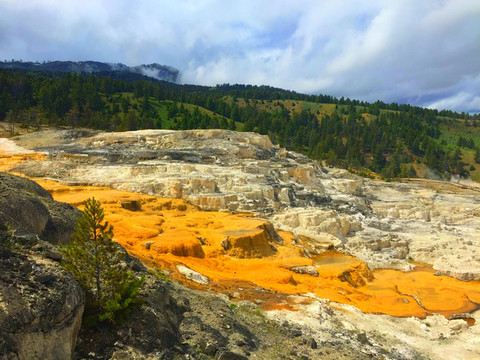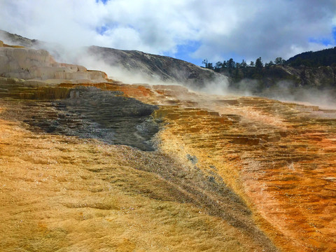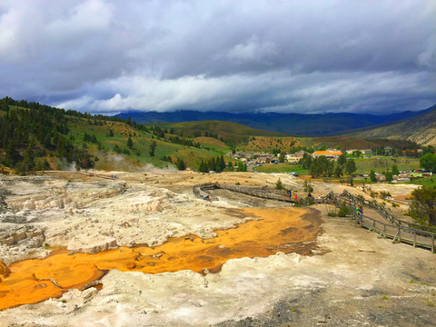 离开诺里斯间歇泉盆地,驱车来到黄石公园又一著名景点——猛犸温泉区。猛犸温泉区位于黄石公园西北,是世界上已探明的最大的碳酸盐沉积温泉,这里是黄石公园管理局总部。因此各种配套服务设施也比较齐全。景观以石灰石台阶为主,这里曾经色彩丰富,但现在大部分温泉已经干涸,导致大量微生物死亡,同时也失去了颜色,死掉的细菌变成灰白色的粉末,残留在乾枯了的大台阶上,形成了奇特的地貌。