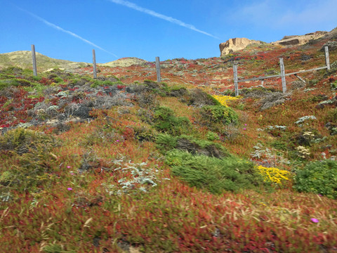 游览了比克比斯河大桥,明知道由于Pfeiffer Canyon Bridge大桥损毁前行的道路封路,我们仍继续向前,看是否能碰上运气看看大瑟尔Pfeiffe Beach紫色沙滩。走了半个小时,巨大的路障阻挡了我们前进的步伐,但我们一点也不感觉到遗憾,因为前行这一段海岸线非常漂亮震撼。