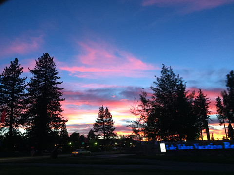 玩了一会,荳妞索性把鞋脱了,开始在湖边尽情地挥洒,一会儿玩沙,一会儿戏水;一会儿逗湖中的鸭子,一会儿往湖中丢石子......玩到太阳快要下山了,我们只好收拾东西,前往南太浩湖酒店。在前往酒店的途中,太浩湖的夕阳太美了,霞光万丈,紫霞漫天,豆妈的手机拍个不停。