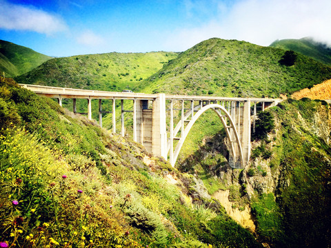离开卡梅尔,来到了赫赫有名的比克斯比河大桥。大桥于1931年开始建造,1932年完工并通车,长218米,宽7米,高85米,建成之初是世界上最大的单拱水泥桥。大桥跨越一个巨大的深涧,从远处看,很壮观,很险峻,拱形桥洞在蓝色大海衬托下显得非常优美,是美国西海岸最上镜的大桥之一,大桥甚至被印到美国的邮票中,深受游客欢迎。