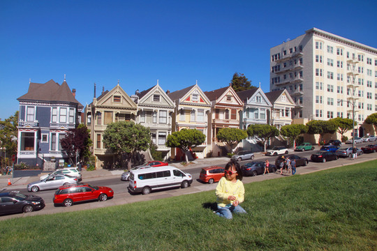 参观完亚洲艺术博物馆,我们来到了旧金山六姊妹。六姊妹位于阿拉莫广场的对面,被人们称为彩绘仕女(Painted Ladies),是六栋不同颜色维多利亚风格的连体的房屋。六姊妹之所以被世人所关注,是因为其经历了1906年的旧金山大地震却完整的保留了下来。