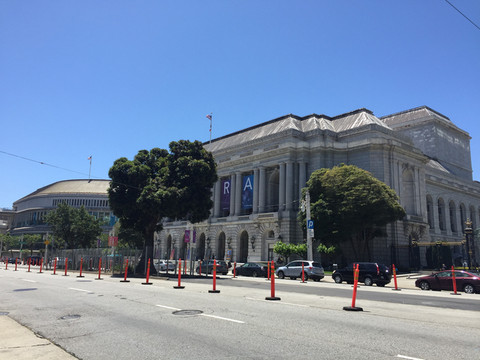 市政厅对面就是战争纪念歌剧院(War Memorial Opera House)和旧金山表演唱艺术图书馆(SF Performing Arts Library),这也是两座有着历史感的建筑。我们去时,正好赶上这个Van Ness Ave.大街修缮,摆上了很多雪糕桶,我们只能站遗憾在外面欣赏。